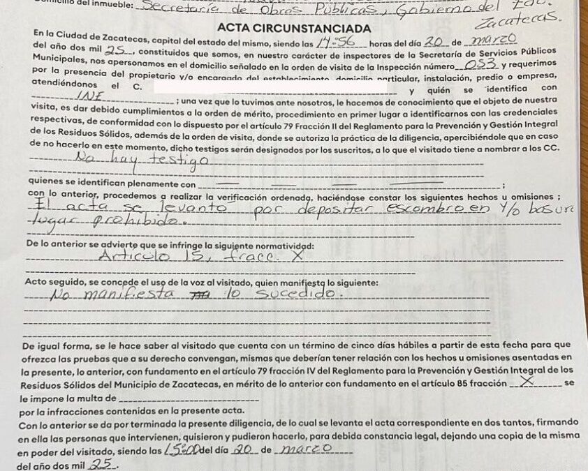 La infracción fue documentada mediante un acta circunstanciada, la cual se entregó formalmente a la Secretaría. A partir de la fecha de notificación, la dependencia estatal cuenta con cinco días hábiles para ofrecer las pruebas y argumentos que considere pertinentes para su defensa.
