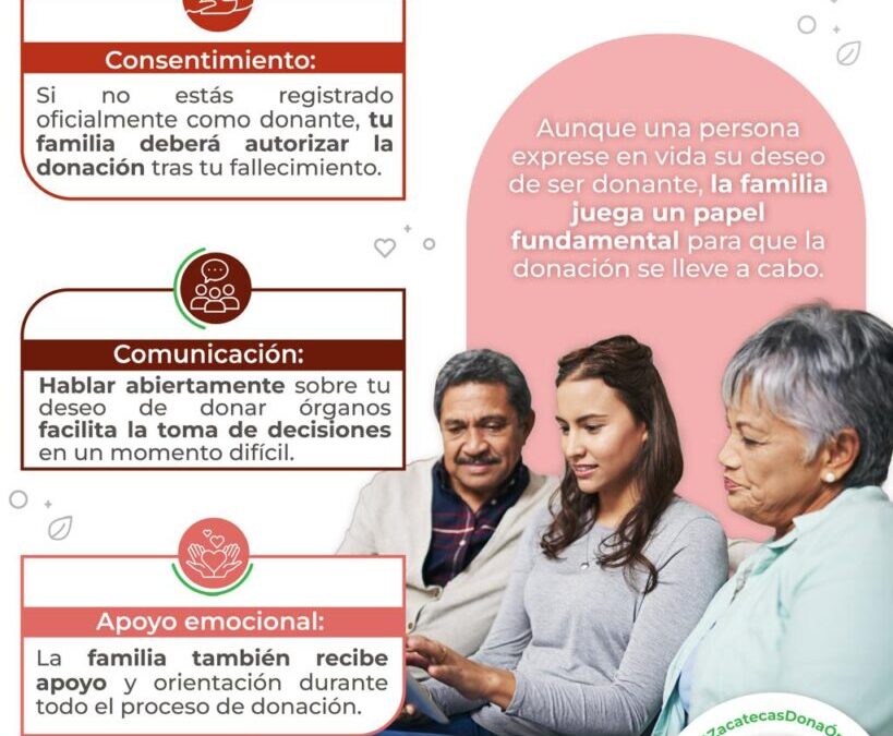 Zacatecas, Zac., 9 de julio de 2025.- Fomentar valores relacionados con el altruismo y la generosidad es una acción emprendida por el Gobierno de Zacatecas, encabezado por el mandatario estatal David Monreal Ávila; a través de la Secretaría de Salud (SSZ), hace un llamado a la sociedad para hablar en familia sobre el tema de donación de órganos y tejidos.
