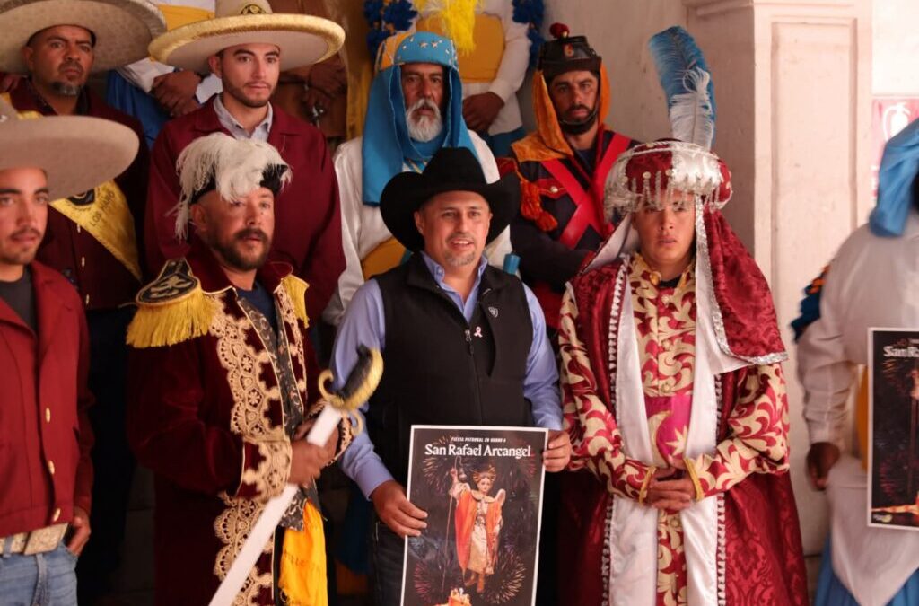 El presidente municipal Rodrigo Ureño Bañuelos encabezó la rueda de prensa en la que se presentó el programa de la fiesta patronal de la comunidad de Los Haro, dedicada a San Rafael Arcángel. Esta festividad es promovida por el Ayuntamiento de Jerez como parte del impulso al turismo religioso en el municipio.