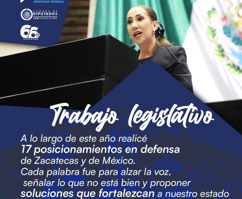 En este año de trabajo presentó 14 iniciativas propias, 21 proposiciones con puntos de acuerdo, 17 posicionamientos en el Pleno, subió a la Tribuna en más de 20 ocasiones, no faltó a ninguna sesión, participó en 86 votaciones, se adhirió a 335 iniciativas y fue la única en exigir el regreso del Fondo Minero, colocándose como una zacatecana de gran participación.
