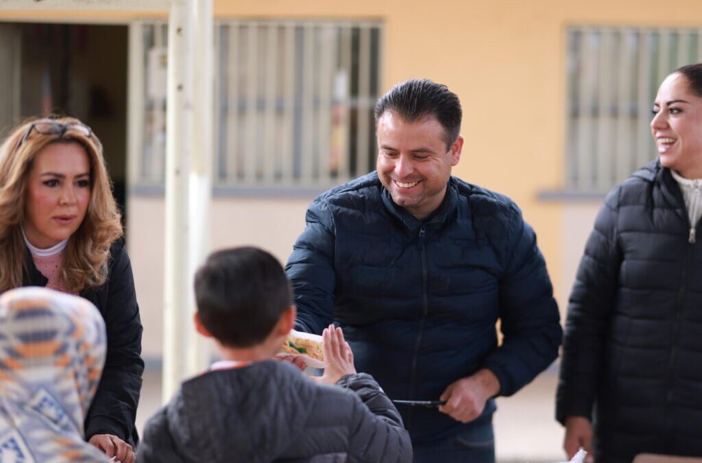 Durante su visita a la Primaria Francisco Goitia, en el Barrio de los Olivos, el primer edil participó en la ceremonia de honores a la bandera. Tras el acto cívico, atendió la gestión del cuerpo docente, quienes solicitaron el cercado perimetral de la cancha de fútbol.