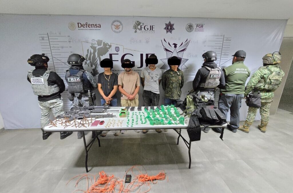 Zacatecas, Zac., 13 de febrero de 2026.– La Mesa Estatal de Construcción de Paz y Seguridad informa que, tras la agresión registrada este jueves en el municipio de Villanueva, fue desarticulada una célula delictiva que operaba en la región, mediante un operativo coordinado que permitió la detención de cuatro masculinos, entre ellos el jefe de plaza.