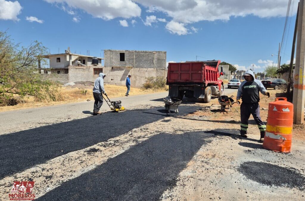 El Presidente Municipal de Morelos, Zacatecas, Profesor Sergio Vázquez Luján, continúa con los trabajos del Programa de Bacheo en la calle Terracería, ubicada en la comunidad de Hacienda Nueva.