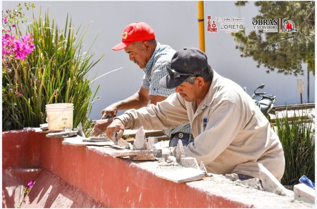 Personal de Obras y Servicios Públicos continúa con los trabajos de rehabilitación en el Jardín del Indio, en Loreto, Zacatecas, con el objetivo de mejorar la imagen urbana y brindar un espacio más digno para la ciudadanía.