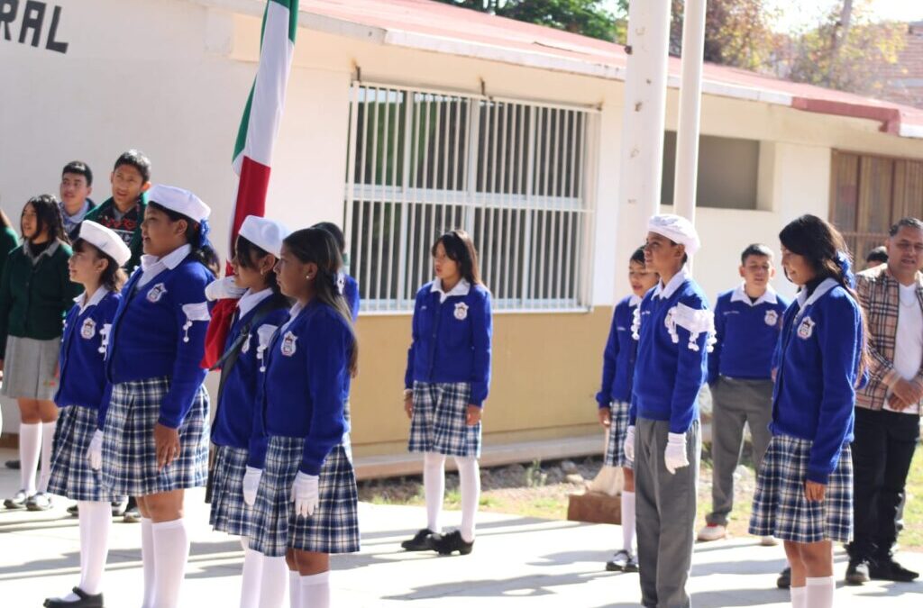La ceremonia se realizó en la Escuela Primaria Luis Moya, con la participación del Jardín de Niños Nuevo Amanecer y la Telesecundaria Ramón López Velarde, destacando el compromiso de las instituciones educativas en la formación cívica de la niñez y juventud.