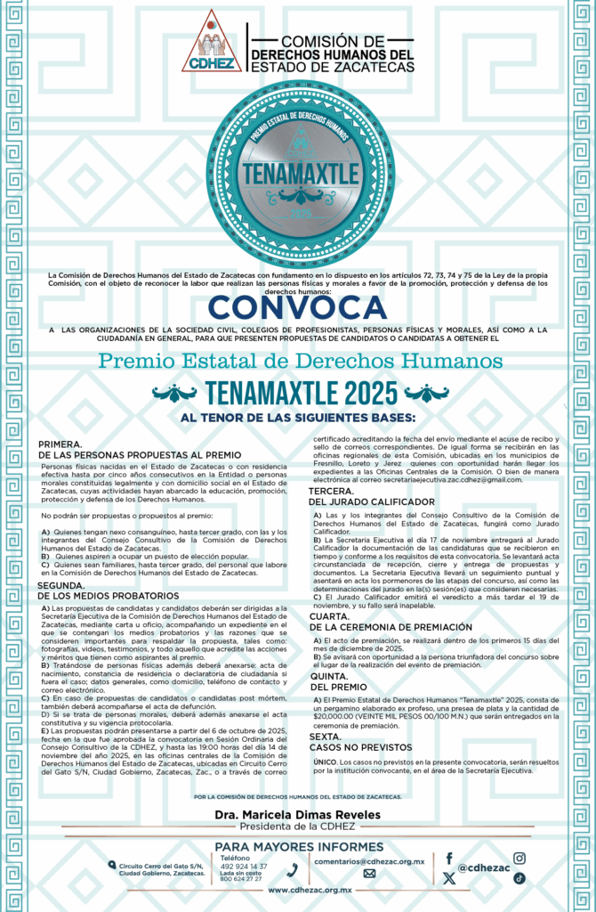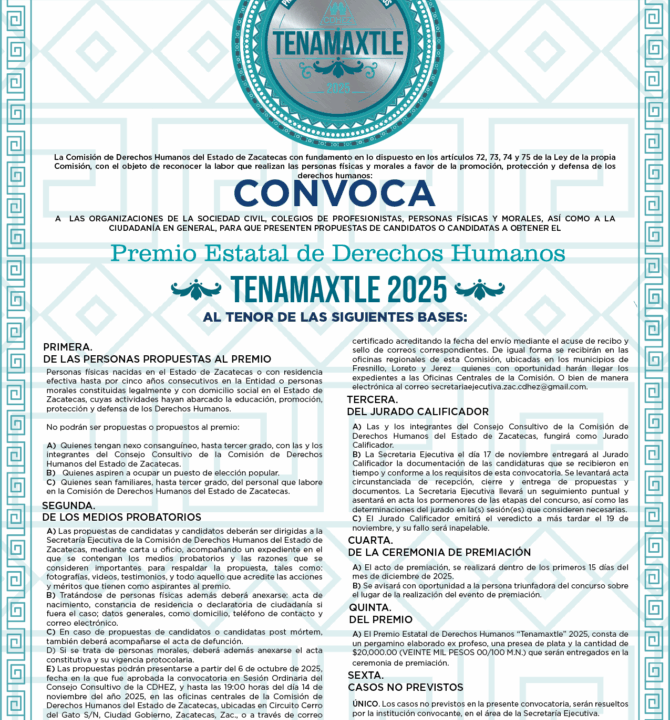 La Comisión de Derechos Humanos del Estado de Zacatecas (CDHEZ), a través de su Presidenta, Dra. Maricela Dimas Reveles, hace un llamado a organizaciones de la […]
